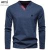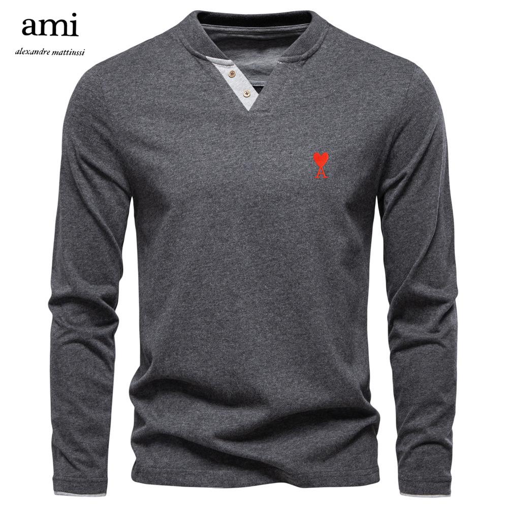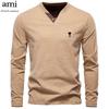 AMI 2025 Autumn New Embroidery Men's Fashion Color Cotton Solid Color Long Sleeve T-shirt V-neck Casual Men's Top T-shirt