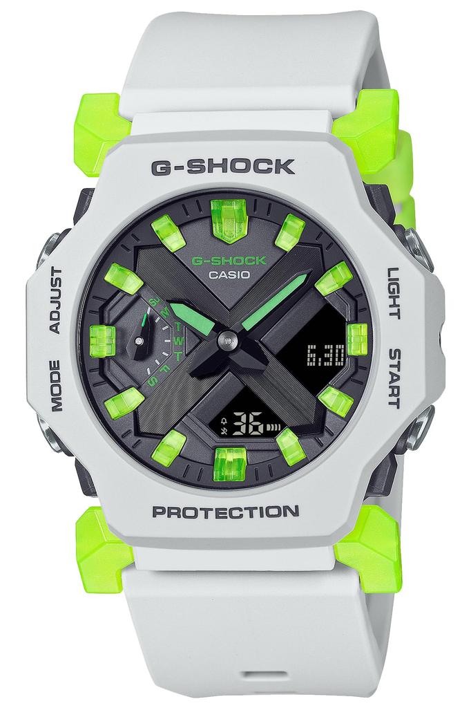 - Apresentando a chamativa série Virtual Mix em amarelo-esverdeado vívido da G-SHOCK, o relógio resistente que continuou a evoluir em busca de uma resistência implacável desde seu lançamento em 1983. Os modelos base incluem o GA-B001 com Bluetooth®, o GA-2300 com seu design minimalista e o GD-B500 com seu rastreador de passos e Bluetooth®. A cor base é cinza claro com verde-amarelado (verde fluorescente) partes do esqueleto. O mostrador é acentuado com diferentes tons de cinza e preto, criando um design esportivo e futurista.. O vívido amarelo-esverdeado é chamativo, tornando este um design legal que pode ser usado numa ampla gama de estilos, do desportivo ao casual.