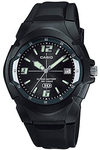 This is a three-hand watch with a date display. It features a rotating bezel and 10 ATM water resistance.