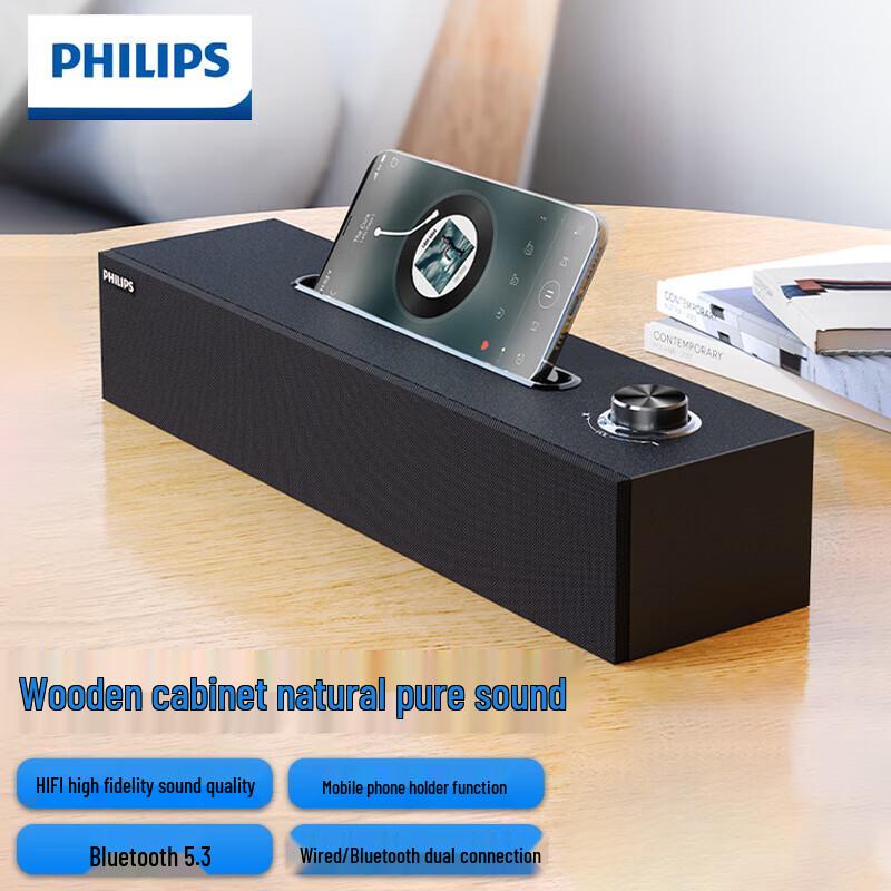 Experience rich audio with the Philips SPA3808 Bluetooth Computer Speaker. Designed for desktop gaming and home use, it delivers powerful heavy bass and connects seamlessly via Bluetooth 5.3. Its sleek wooden design is conveniently powered by USB.