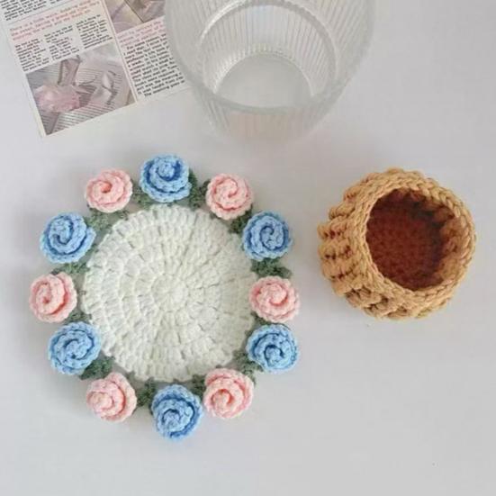 This unique coaster doubles as a charming bouquet of crochet flowers, offering multifunctional use. Simply remove the flowers and lay them flat to use as an anti-scalding, non-slip, and absorbent coaster. When placed inside the brown crocheted basket, it transforms into a delightful desktop ornament, adding warmth and style to any space.