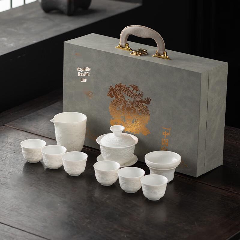 Jade-Inspired Embossed Dragon Ceramic Tea Set