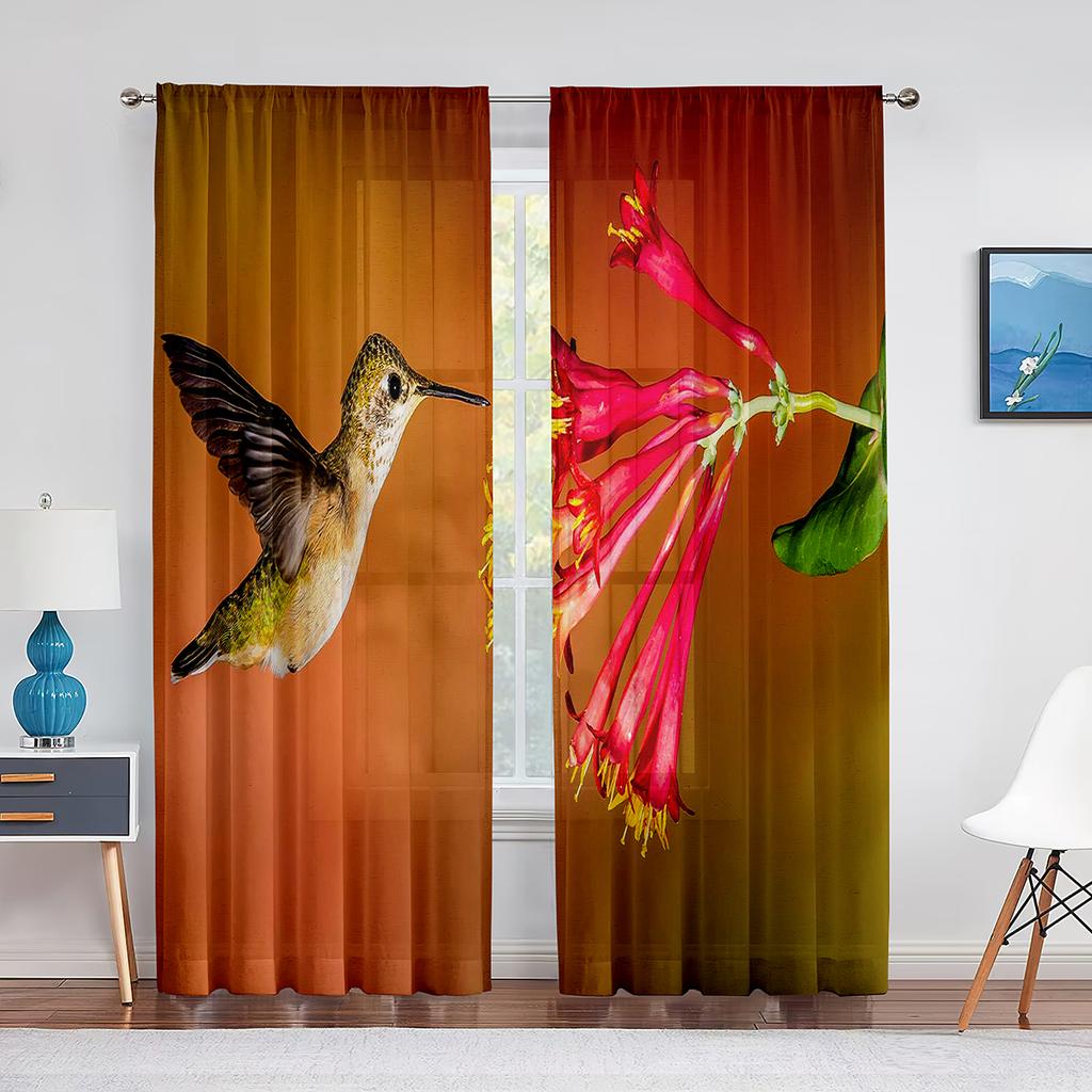 Cortina transparente de beija-flores e flores de primavera para sala de estar, quarto, decoração para casa, suprimentos para janelas, cortinas de tule de chiffon estampadas
