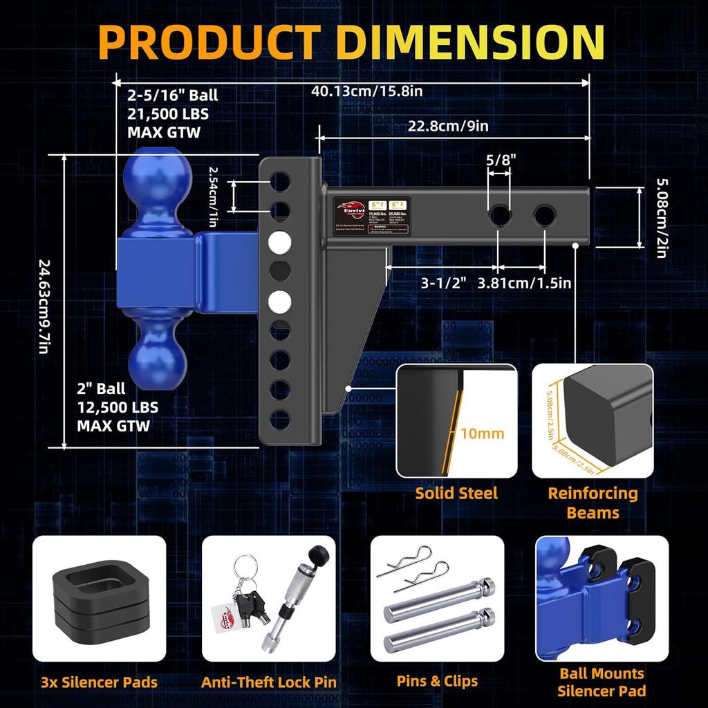 Engate de Reboque Ajustável, Receptor de 2', Queda/Elevação de 6', Bola de 2' e 2-5/16', 21.500 GTW, Pinos de Travamento Anti-Furto