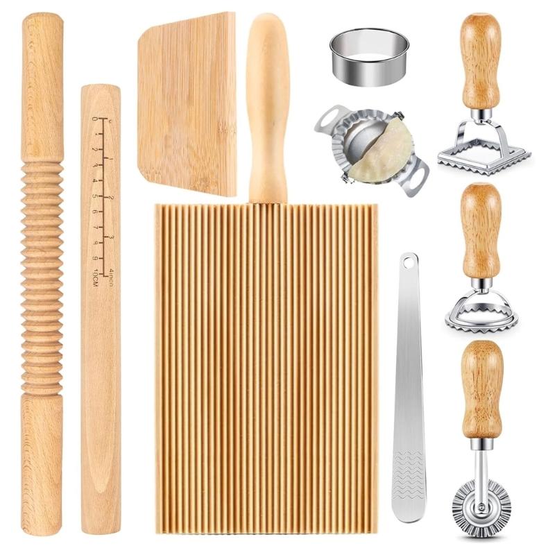 Wood Threaded Rolling Pin Pastas Tool Set Dough Scraper Gnocchi Board Dumpling Maker Ravioli Stamp Cutter Wood Texture