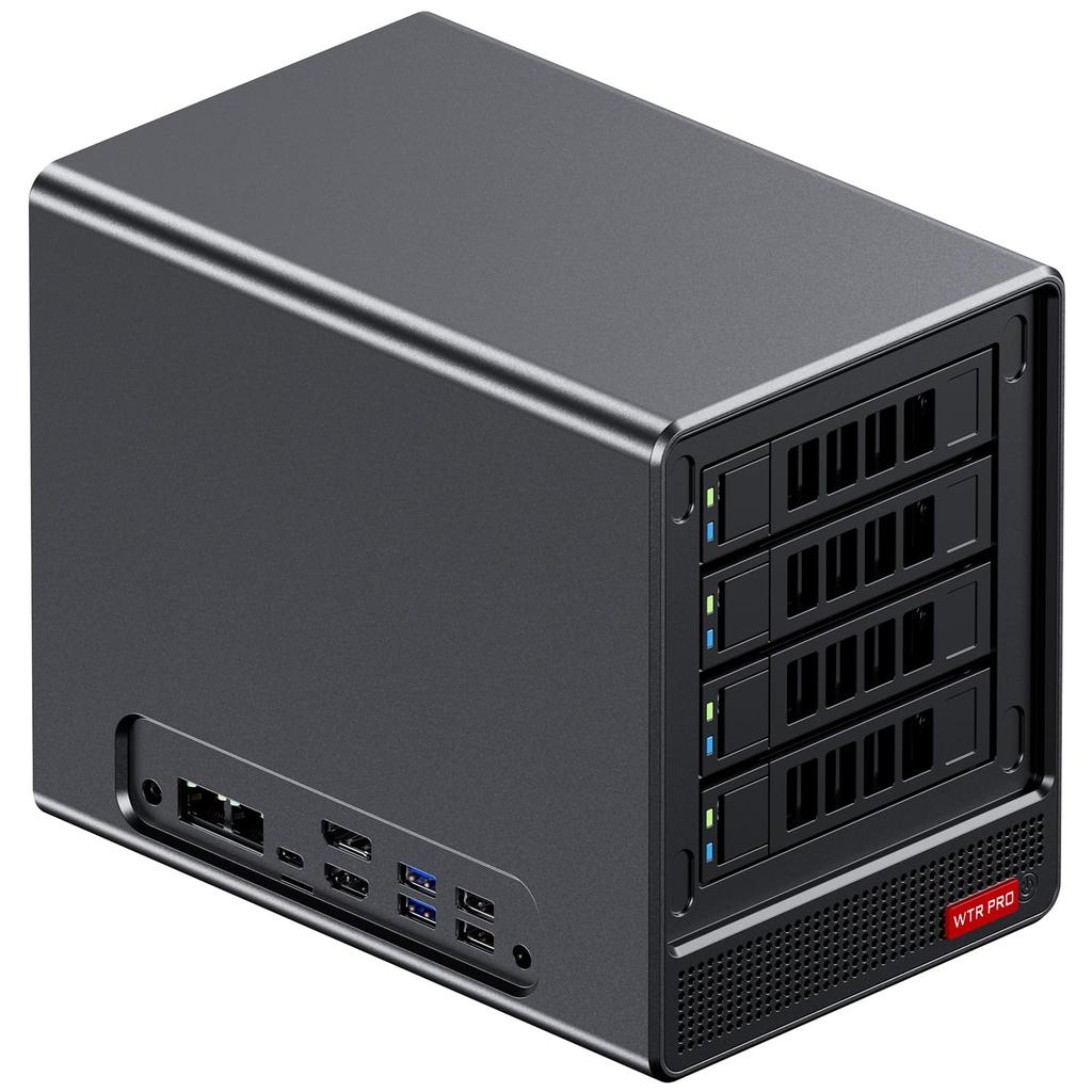 [4-Bay NAS Mini PC with No System Limitations] The AOOSTAR WTR PRO is a NAS mini PC with 4 bays of HDD slots. It supports up to four 3.5-inch SATA HDDs (18TB x 4) for ultra-large capacity expansion. It features a pull-out tray for easy HDD replacement. The aluminum alloy body ensures high-quality construction. The front cover is magnetic, and the power button is equipped with a cover to prevent accidental operation. It's ideal for backing up large amounts of data, such as files, photos, and videos, and allows you to build high-capacity network-attached storage. It can run any x86 architecture software, so it's free from the closed system limitations of traditional NAS manufacturers and is compatible with a variety of operating systems, including Linux, iStoreOS, and Windows.