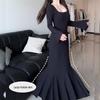 Vestido de manga comprida com emendas Four Seasons Vestido longo Vestido rabo de peixe Temperamento fino