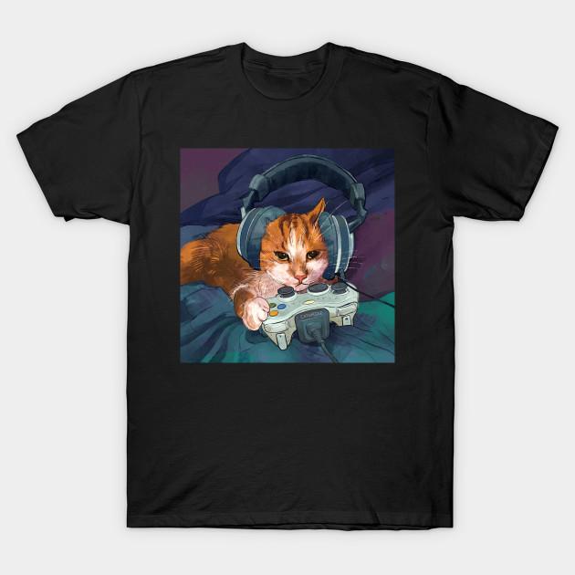 Men Black Print T-shirt Gamer Cat! (Second In The Series) No-Cut Transfer Paper Print Cotton Tshirt