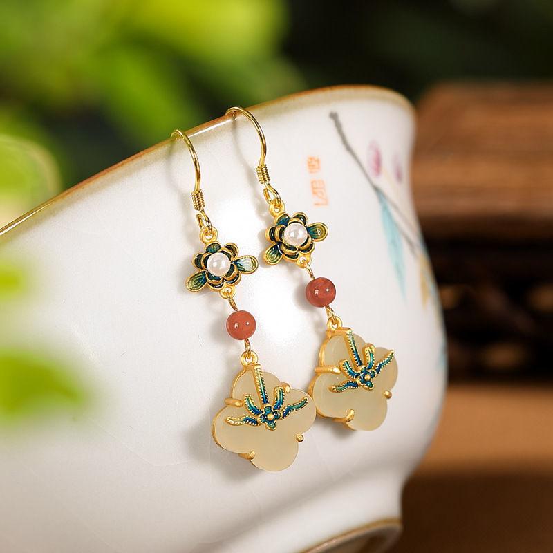 Original Natural Chalcedony Flower Enamel Drop Earrings For Women Exquisite Ancient Rhyme Ethnic Style Banquet Jewelry Gift