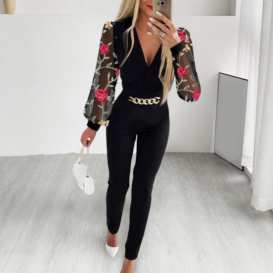 The jumpsuit features V-neck design, waist cinching, chain decoration, rose applique and small leg design.