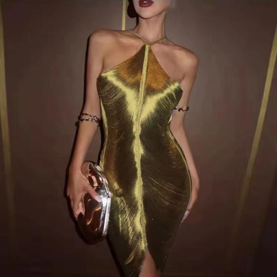 Características: Este vestido moderno apresenta um decote frente única e um design que envolve a cintura, com uma silhueta em forma de T que embeleza sua figura. O design brilhante a óleo irradiado por laser adiciona um toque de personalidade ao próprio vestido.