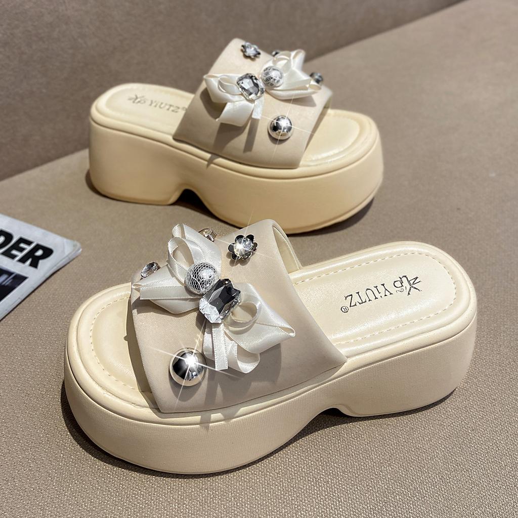 Moda 8CM Chinelos de Plataforma Femininos de Cristal Flor Sandálias Laço Salto Alto Anabela Verão Chinelos de Praia de Cristal Sapatos Confortáveis para Senhora