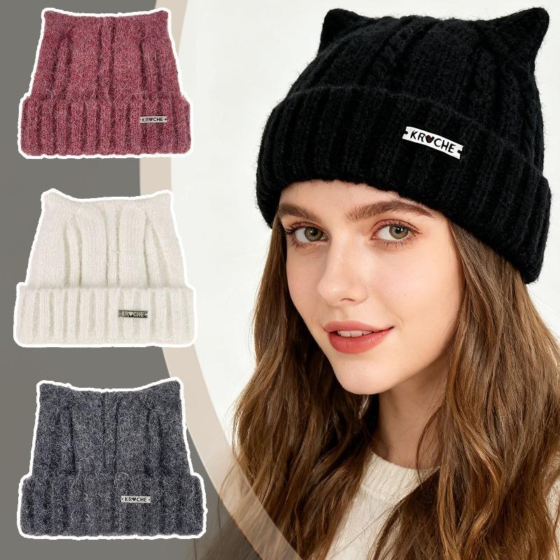 Cute Cat Ears Beanie Hat for Women Solid Color Warm Knit Cap Outdoor Ear Protection Pullover Cap Crochet Bonnet
