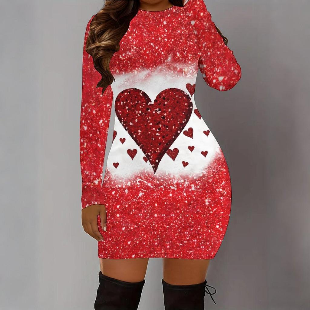 2025 Autumn and Winter New 3D Love Pattern Print and Dyeing Women's Fashion Long-sleeved Round Neck Hip-wrapped Dress Valentine's Day Limited