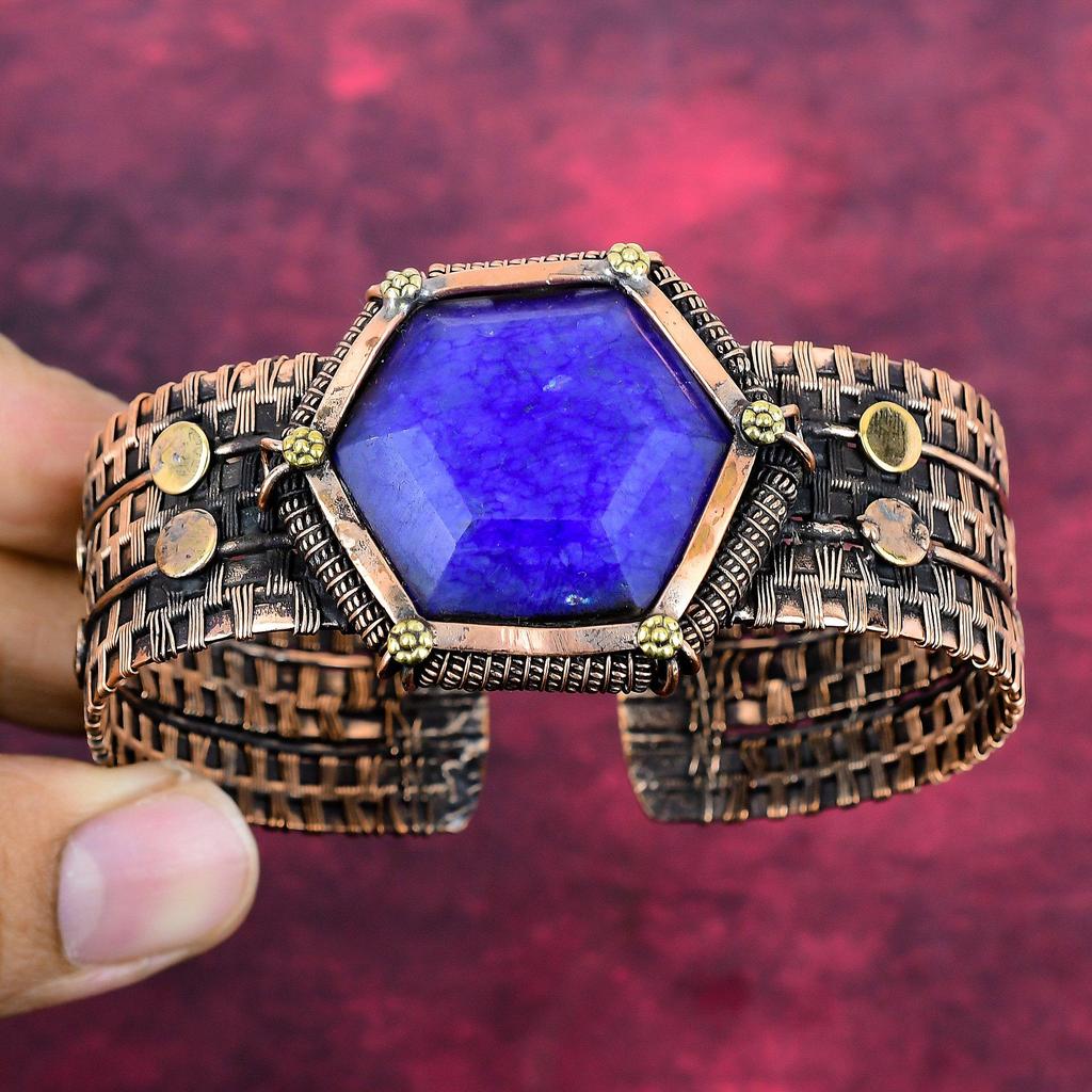 Faceted Blue Sapphire Bangle Copper Wire Wrapped Jewelry Adjustable Bangle
