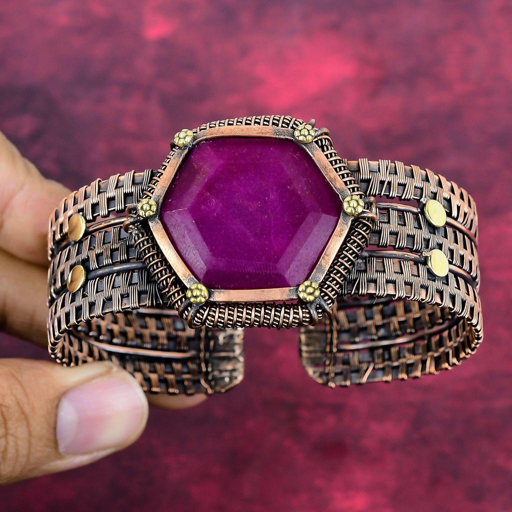 Pulseira de Rubi de Caxemira Facetado Joias Envoltas em Fio de Cobre Pulseira Ajustável Joias com Pedras Preciosas