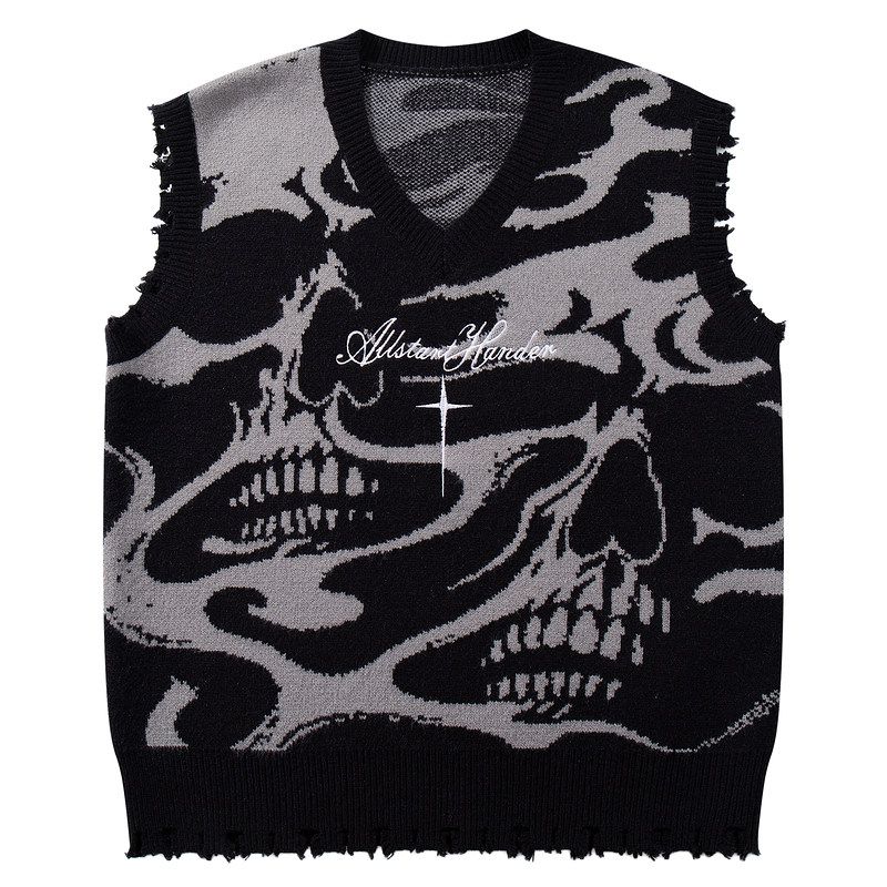 51 Hip-Hop American Street Style Skull Cool Loose Knit Sweater Unisex Trendy Brand Letter Embroidery V-Neck Sweater Vest