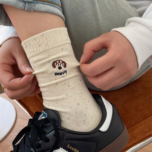 Korean Idea Yarn Embroidery Dog Cute Socks For Women Versatile Cartoon Medium Solid Color College Style Pile Socks