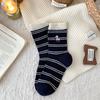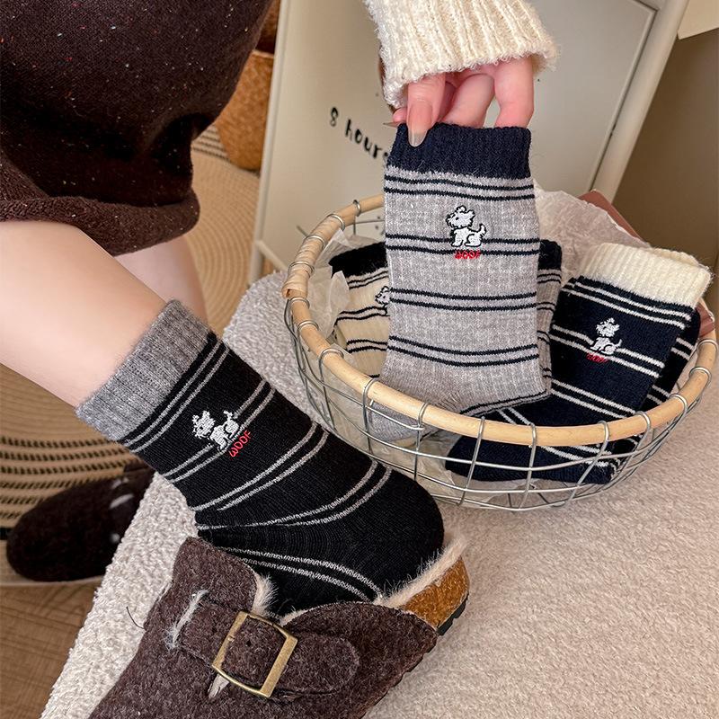 Winter Warm Cartoon Embroidered Puppy Wool Black And White Striped Socks Mid-Leg Socks Korean Thickened Cute