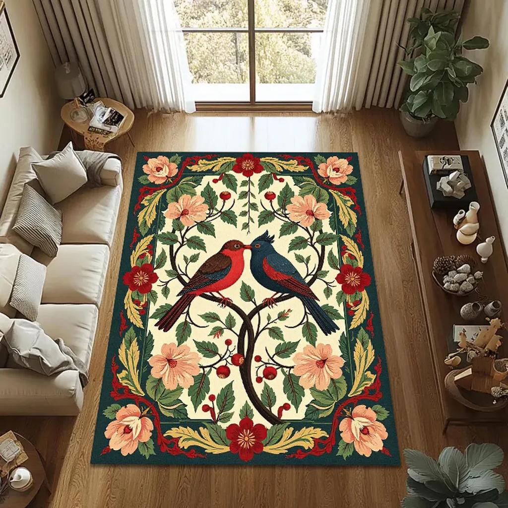 Bohemian Arts Rug,Vintage Inspired Bird and Floral Carpet,Floral Botanical Decor,Elegant Nature Print Floor Mat