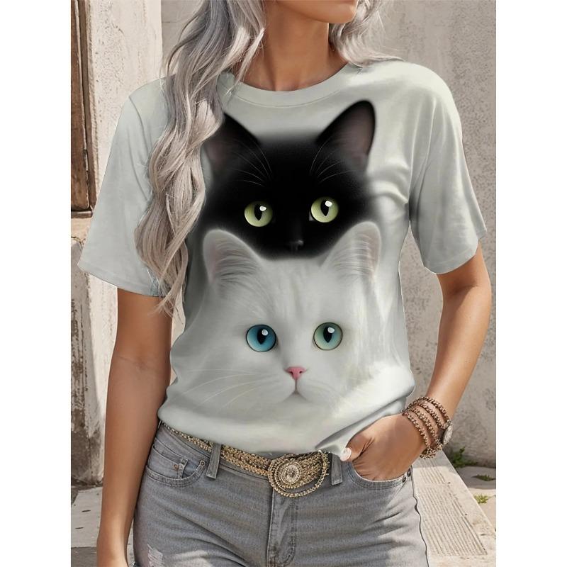 Stylish Animal Cat Print Tops Loose Crew Neck Tops Versatile T-Shirts Women’s