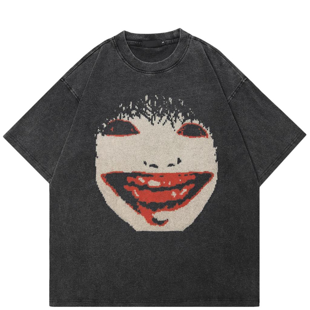 2026 Unisex Washed Black T-Shirt Streetwear QUARTER 24 Face Graphic A37T037