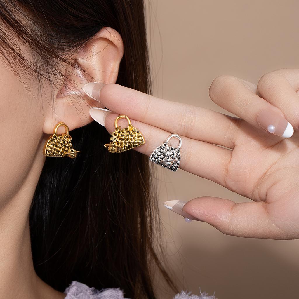 Brincos de Tarraxa Formato de Bolsa de Metal Retrô Estilo Hong Kong Exquisitos Literários de Nicho Personalidade Única Senso de Design Brincos Femininos