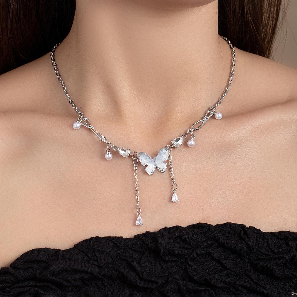 Colar de Borboleta de Cristal com Borla e Pérolas Corrente Premium para Clavícula com Cravação de Diamantes de Luxo Leve Acessórios de Corrente de Pescoço de Nicho de Luxo Leve
