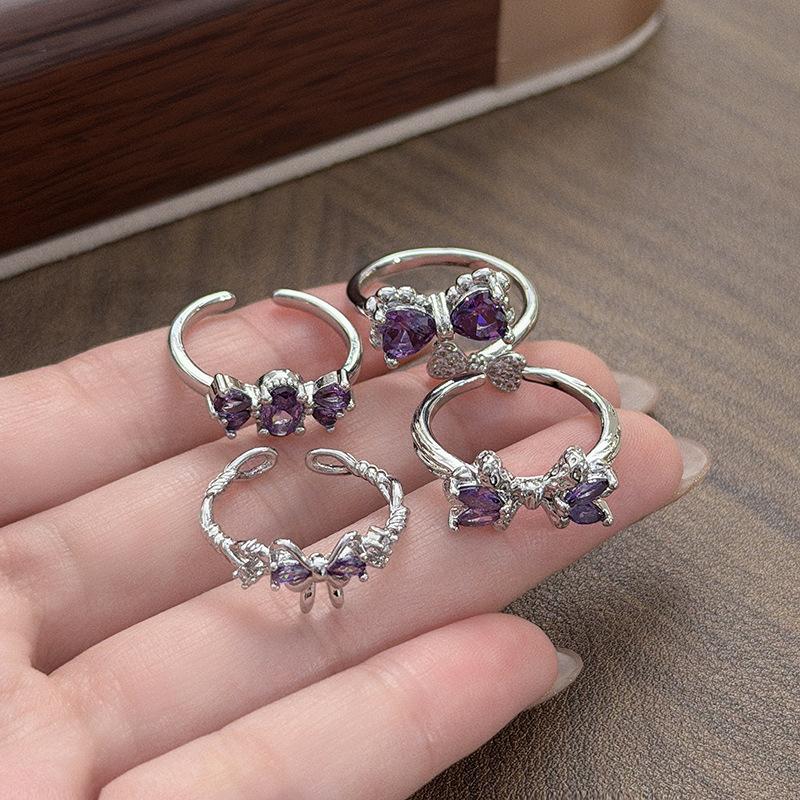 Sweet And Cool Girl'S Heart Bow, Purple Zircon Diamond-Set Open Ring, Light Luxury Niche High-End Sense Stacked Index Finger Ring