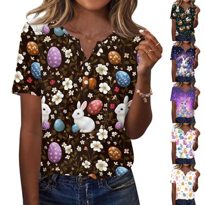 Camiseta feminina estampada botão manga curta diário fim de semana moda básica decote em v regular top