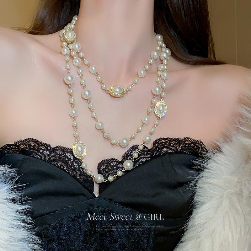 Exaggerated long large pearl necklace multi-layer light luxury niche cheongsam sweater chain stacked neck chain women's decorative accessories