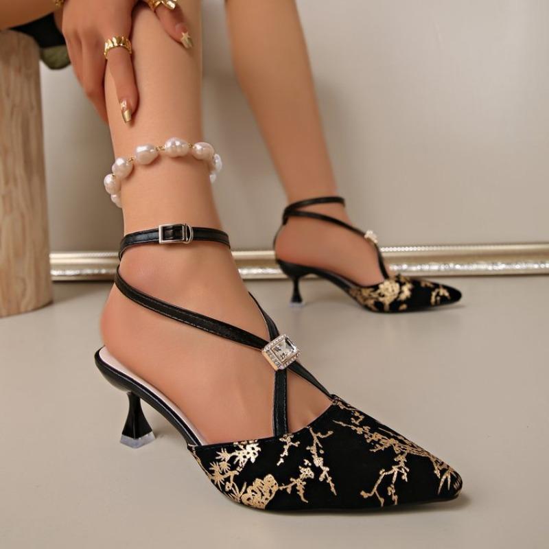 Women's Chinese Style Closed Toe T-Strap Stiletto Heels, Printed Denim Summer Dress Sandals