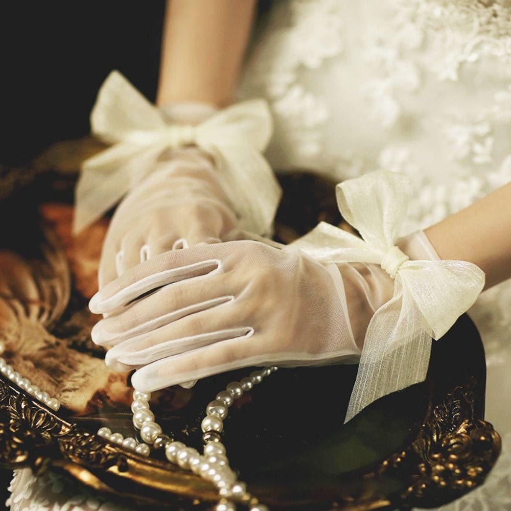 Lace Mesh Wedding Gloves Bow Pearl Chiffon Gloves Vintage Wedding Accessories Prom Cosplay
