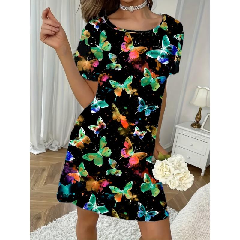 Women'S Butterfly Print Dress & Multicolor Floral-like pattern Woman Clothing Round Neck Short Sleeve Sleepwear Y2k Clothes Top