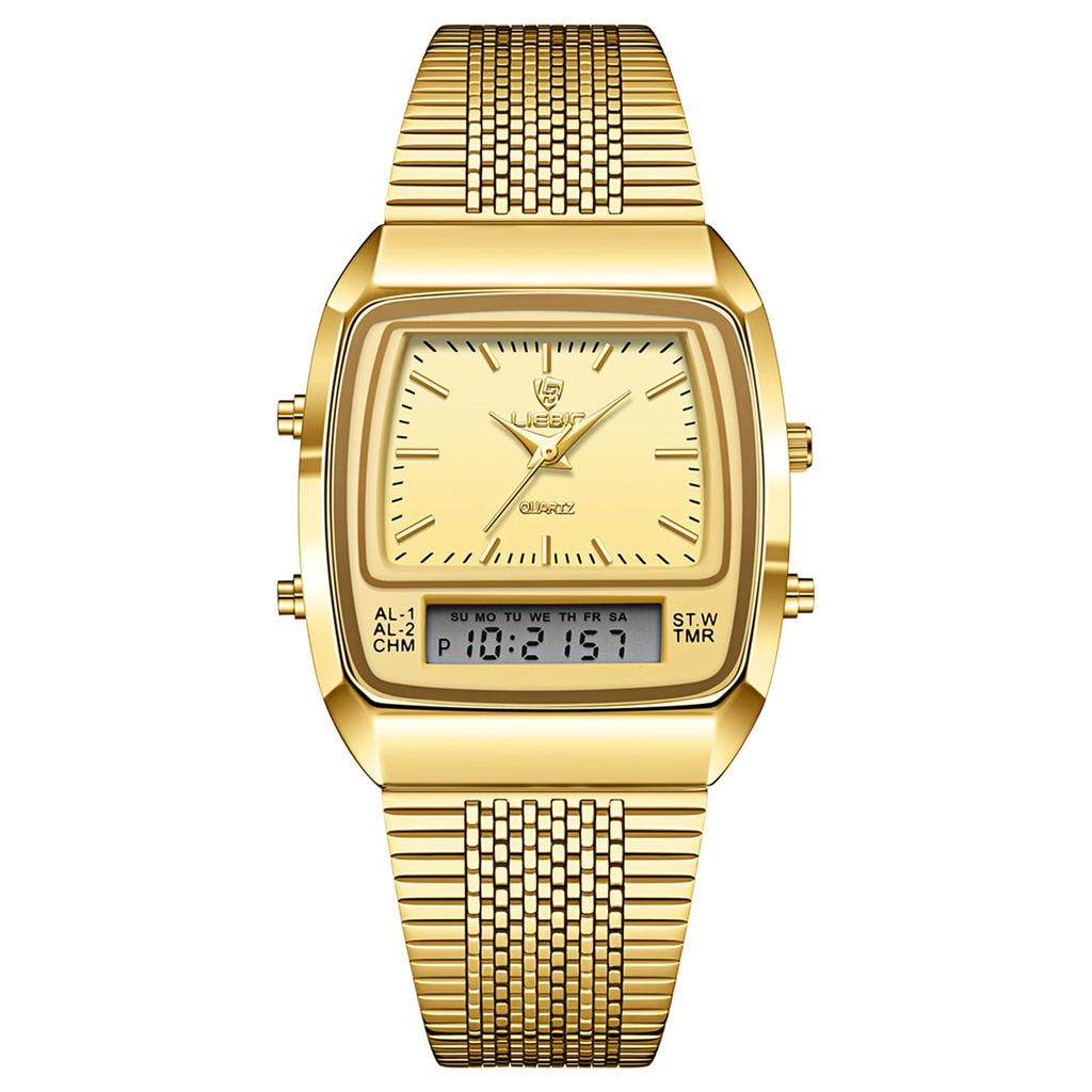 Oidea unisex waterproof and rainproof watch with a square dial, calendar function, bar indexes, quartz movement, gold case, and gold dial. Perfect as