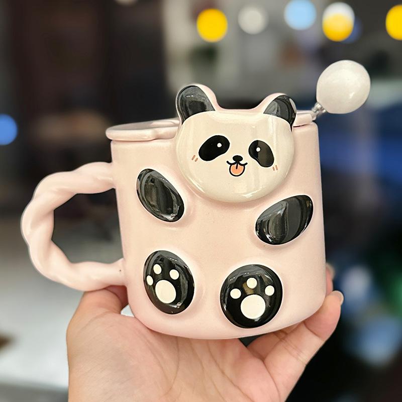 Caneca Panda Cerâmica Relevo Fofa Com Tampa Colher Animal de Desenho Animado Tridimensional Copo de Água Doméstico Lembrancinha Pequena e Fresca