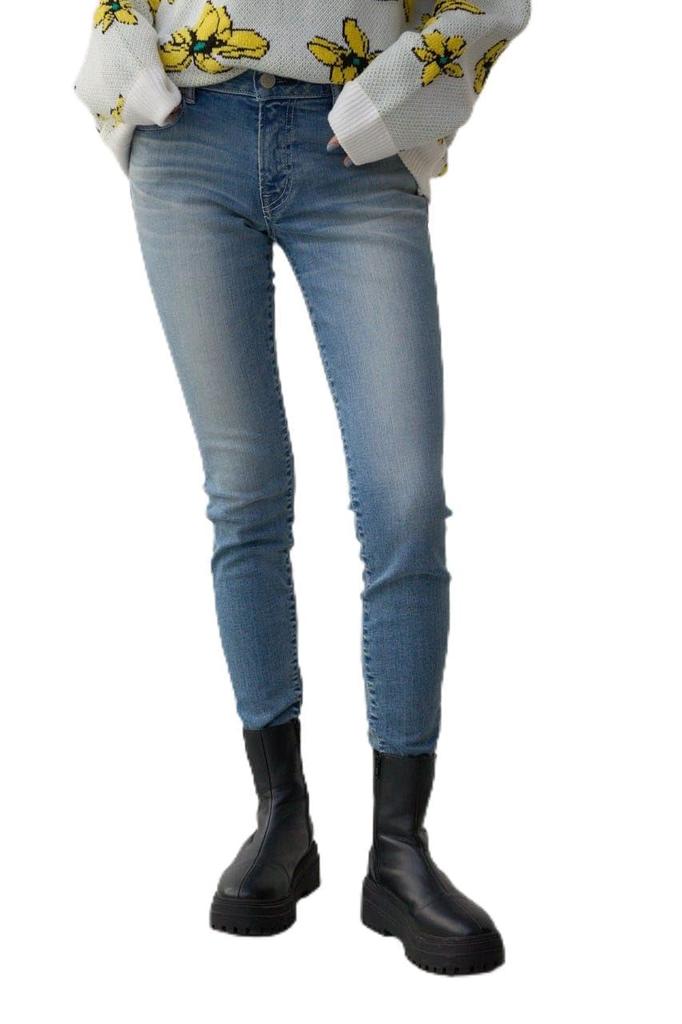 A quantidade perfeita de elasticidade, nem muito elástica nem muito rígida, garante um ajuste confortável o dia todo.. Seu apelo reside no fato de criar um efeito emagrecedor sem apertar demais, permitindo um ajuste sem estresse.. O acabamento contrastante com aspecto desgastado e os realces nos bigodes e coxas disfarçam naturalmente as linhas das pernas, criando uma silhueta tridimensional e bonita.. Disponível em três cores: um azul claro com acabamento texturizado, e azul escuro e preto básicos para um visual mais clean.