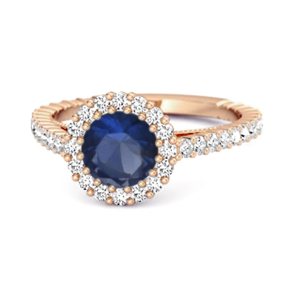 Sterling silver halo ring featuring a 5 mm round blue sapphire and pave accents. A brilliant 1.10 Ct design perfect for special occasions.