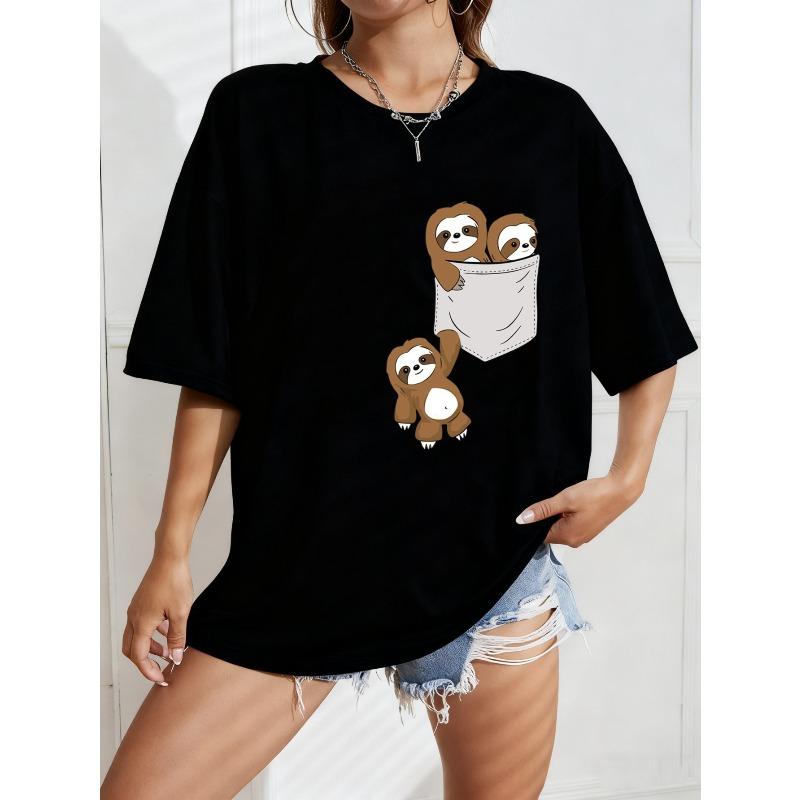 Cute Sloth Pocket Print Oversized T-Shirt White Cartoon Animal Design For Casual Wear And Everyday Outfits