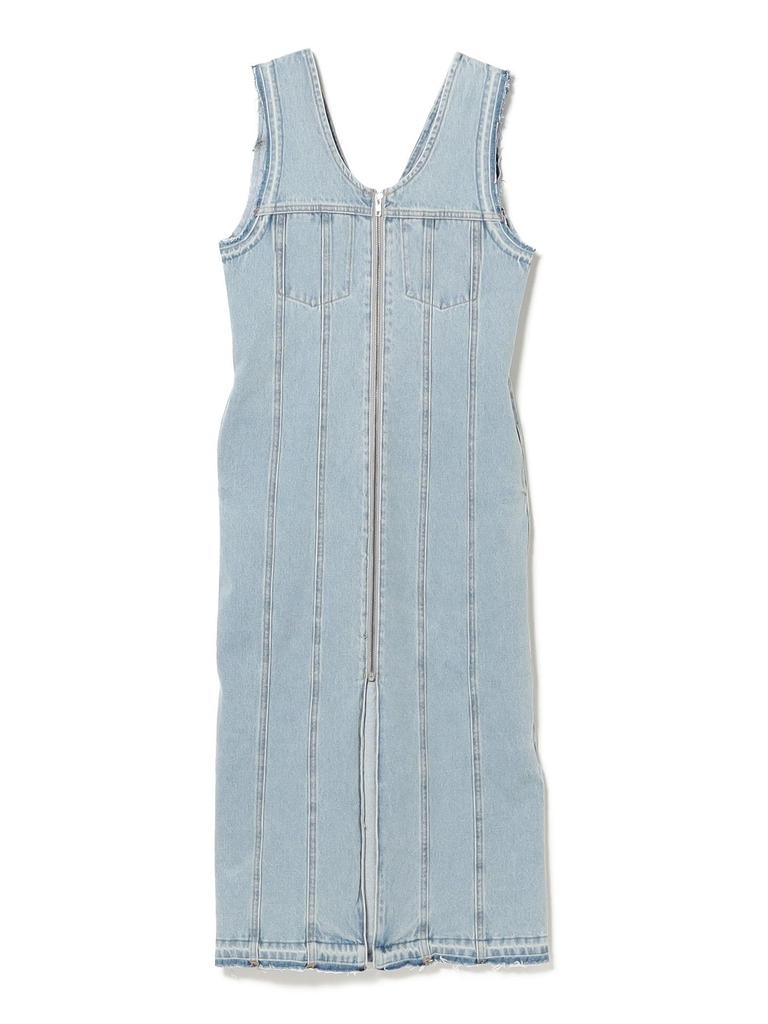This denim dress features a chemically bleached finish. The long, fitted silhouette accentuates a sophisticated look. The zippered front allows for versatile layering options.