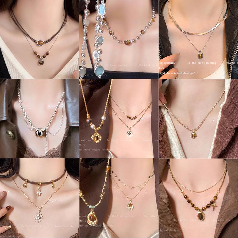 Autumn and winter Maillard tiger's eye stone beaded necklace femininity high-end sweater chain retro simple accessories