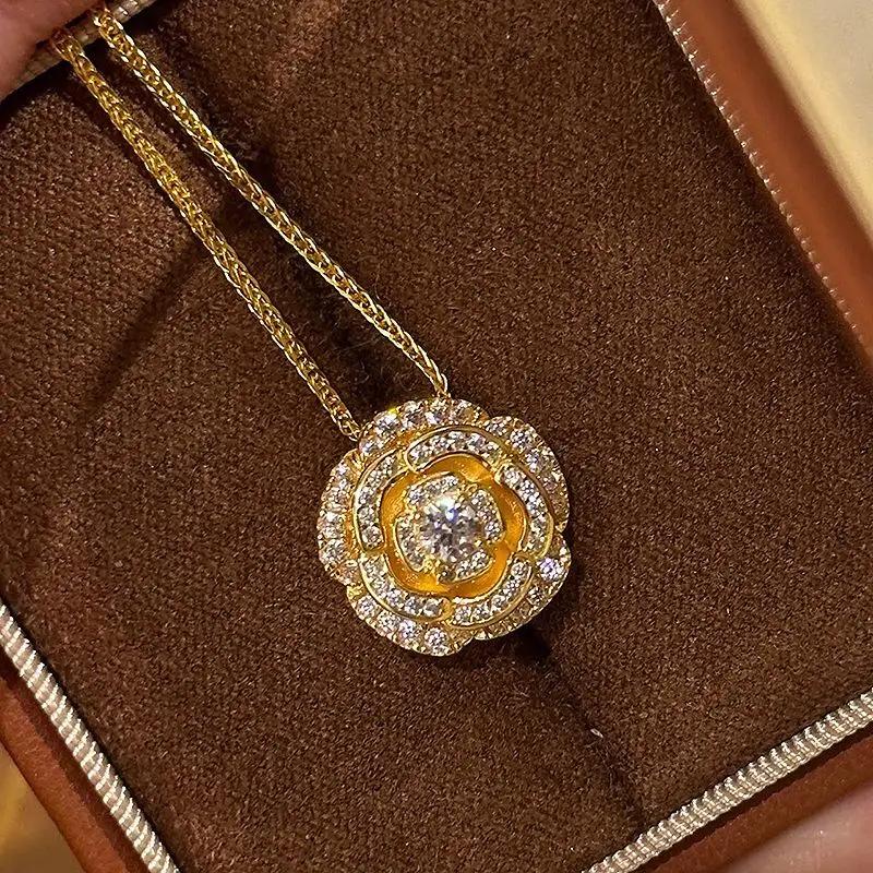 Exquisite and dazzling rotatable camellia flower necklace new in diamond inlaid elegant pendant fashion wedding