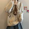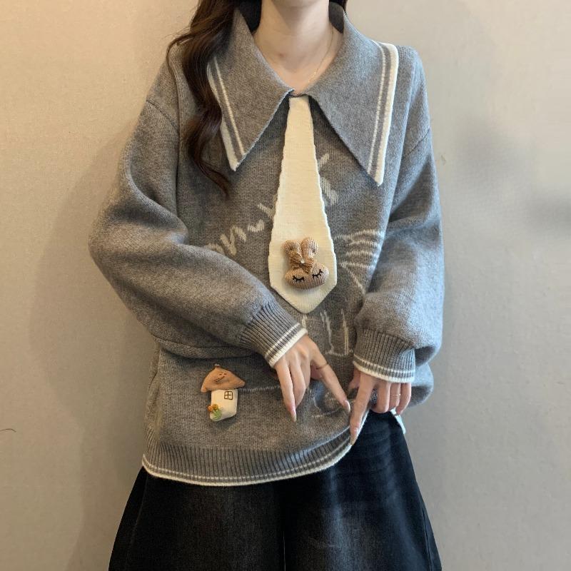College Style Polo Neck Rabbit Embroidery Sweater Women Loose Fit Knitwear Autumn