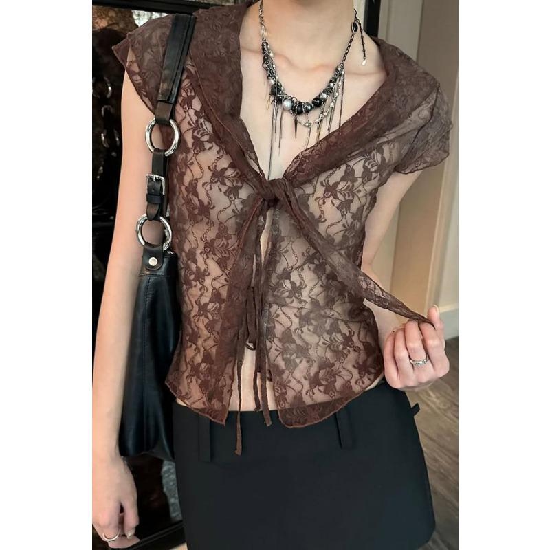 Women's Brown Lace Blouse Sleeveless Tie Neck Sheer Fashion Casual Top