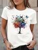 Camiseta Casual Feminina Europeia com Estampa de Árvore e Borboletas - Design Vibrante em Blocos de Cor, Gola Redonda, Corte Regular, Lavável à Máquina, Top para Todas as Estações