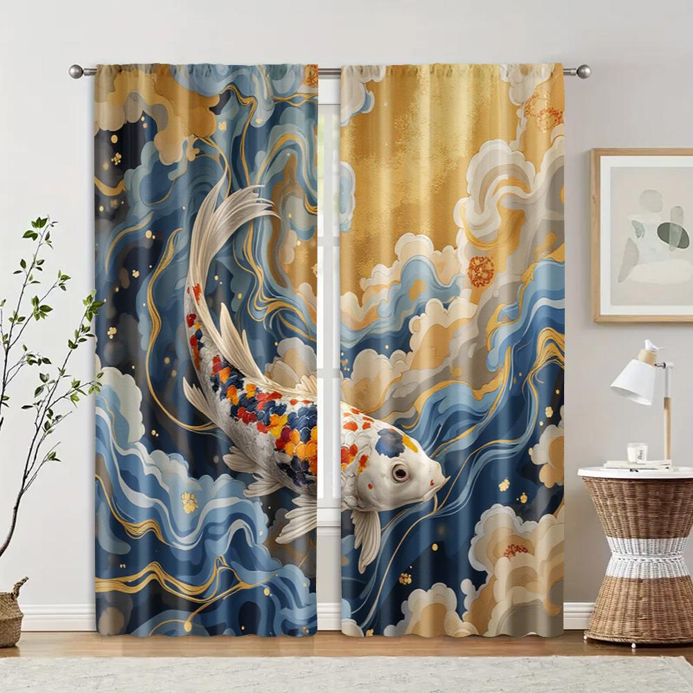 2 pcs filtering curtains (excluding rods non-movable without batteries) Japanese Koi for use in bedrooms and living rooms