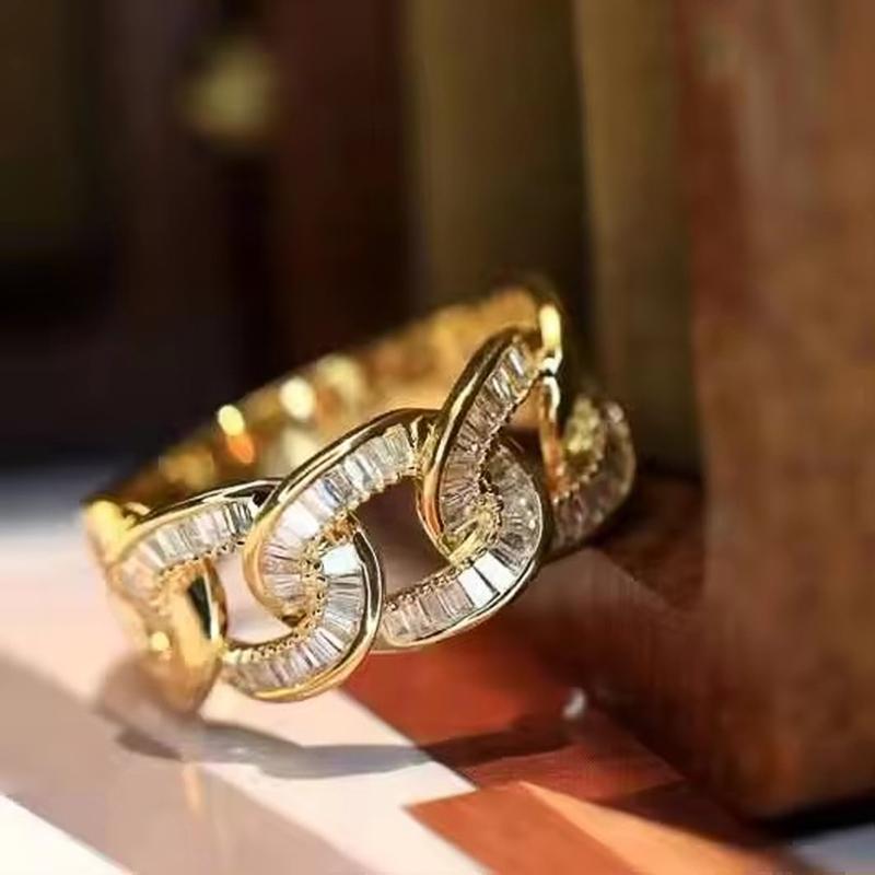 Huitan Trendy Luxury Chain Shape Ring Lady Gold Color Finger Accessories with Brilliant Zirconia Fashion Gorgeous Modern