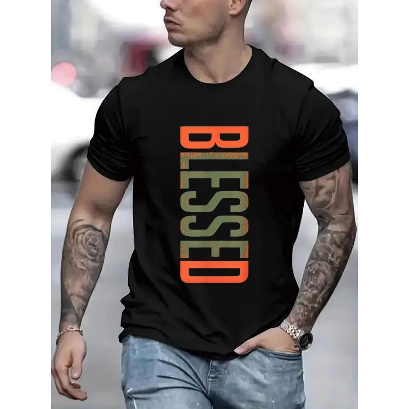 European sizes Men Blessed Graphic Print T-Shirt For Men Casual Short Sleeve Tee 1 Pcs - Comfortable Crew Neck