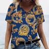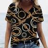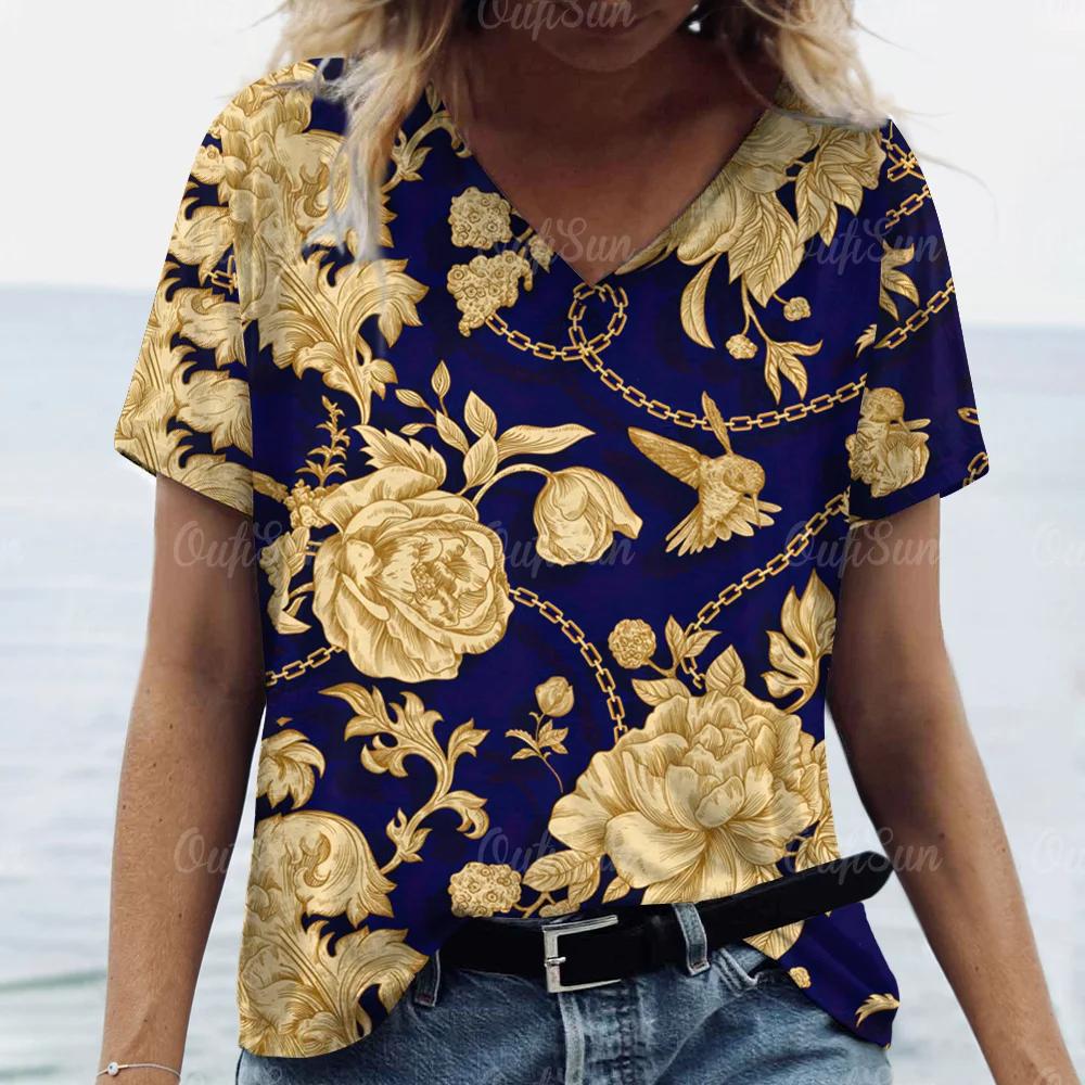 Camiseta feminina da moda verão 2024, estampa dourada, decote em V, tops, camisetas femininas, manga curta de luxo, roupa feminina, vintage, streetwear