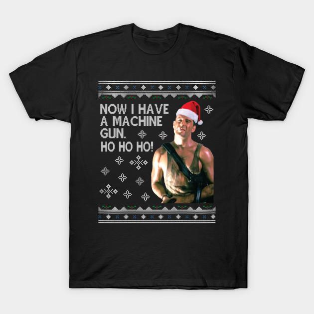 Camiseta Masculina Preta Estampada Die Hard Ho Ho Ho Metralhadora Natal Kint Estampa em Transfer Sem Corte Algodão